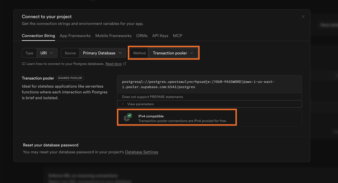 If you face the error `Please use IPv4 compatible supabase connection pooler` go back to Supabase app and make sure to use a connection string which is IPv4 compatible.