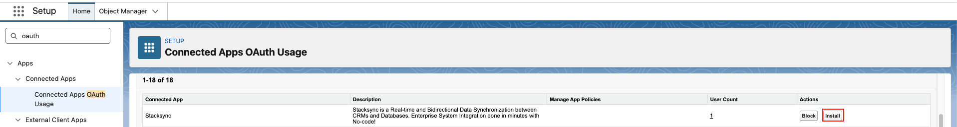 4. Once approved, if you want other users in your organization to be able to install this app, go to **Setup → Connected Apps OAuth Usage**, find **Stacksync**, and click **Install.** After that, selected users will be able to authorize successfully.